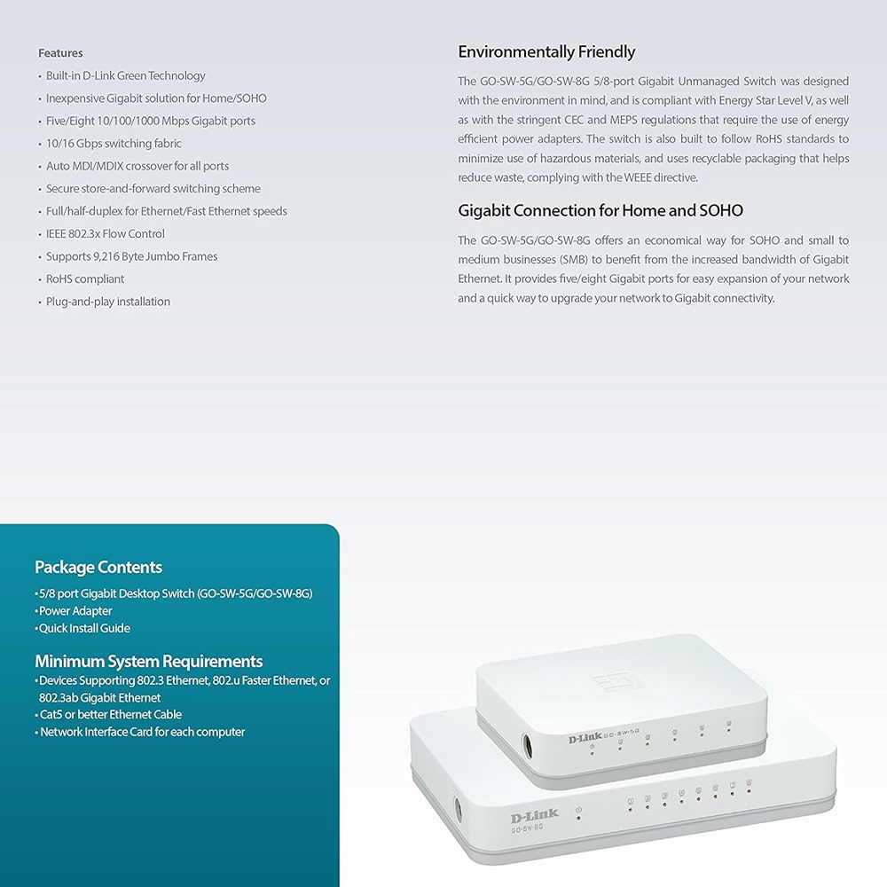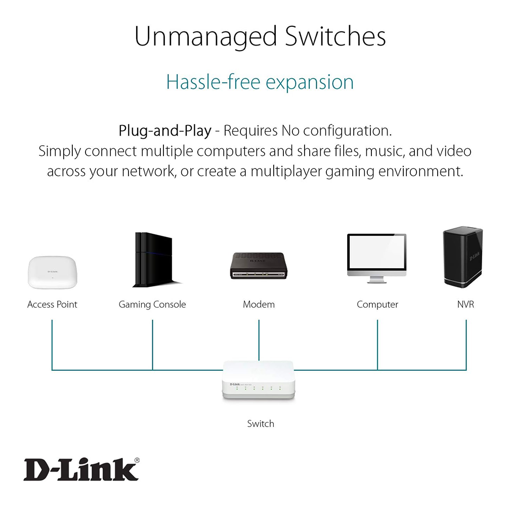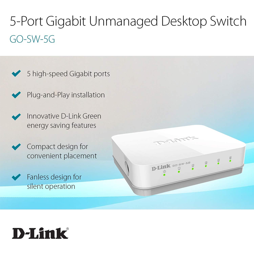 D-Link Ethernet Switch, 5 Port Unmanaged Gigabit Desktop Plug and Play Compact Design White (GO-SW-5G)